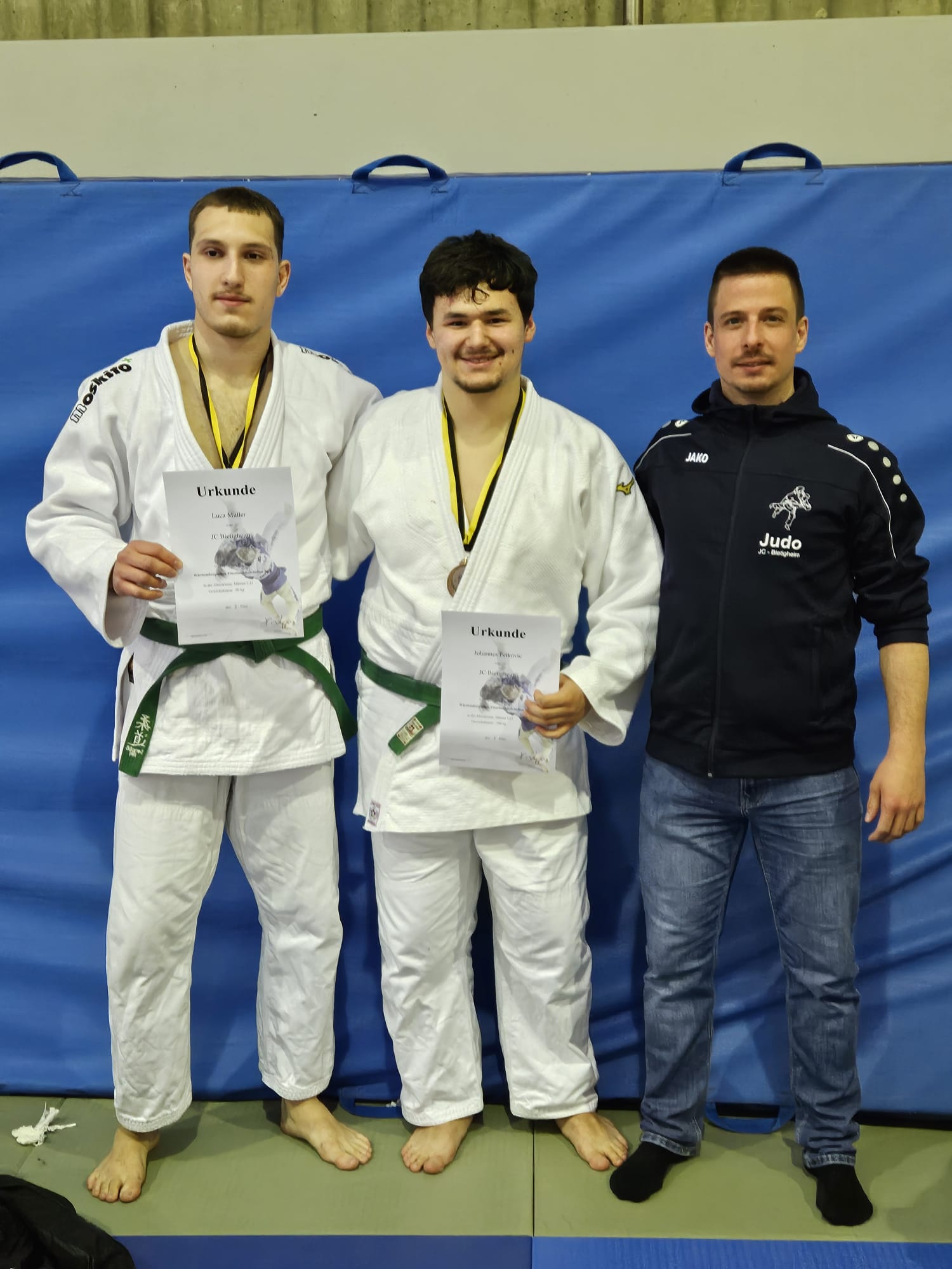 Für den JCB starteten Johannes (-100kg) und Luca (-90kg). Luca hatte insgesamt vier Kämpfe. Seine ersten drei Kämpfe konnte er dominant bestreiten und jeweils vorzeitig mit Ippon gewinnen. Seinen letzten Kampf um Platz 1 musste er gegen einen starken und wettkampferfahrenen Gegner bestreiten.Trotzt viele Bemühungen im Griffkampf gelang es seinem Kontrahänten einen Ippon zu erzielen und den Finalkampf dadurch vorzeitig zu beenden. Dennoch kann sich Luca über die Silbermedaille und den Titel als Württembergischer Vizemeister freuen. Für Johannes war es die erste Meisterschaft nach einer längeren Wettkampfpause. Mit insgesamt drei Teilnehmer in seiner Gewichtsklasse war die Anzahl an Kämpfen zwar überschaubar, dennoch hatte Johannes zwei starke Wettkämpfer in seiner Gewichtsklasse. In beiden Kämpfen zeigte er sehr starke und dominante Ansätze. Diese reichten aber leider nicht für den Sieg. Dennoch kann sich Johannes über den dritten Platz und die Bronzemedaille freuen.