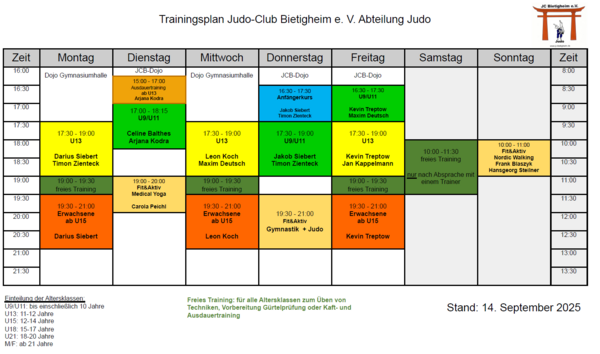 Zur Schulzeit finden die Trainings Montags-Mittwochs im Dojo der Gymnasiumporthalle im Ellental statt. Donnerstags und Freitags findet das Training im JCB-Dojo statt. In den Ferien finden in der Regel alle Trainingseinheiten im Dojo des JCB statt (